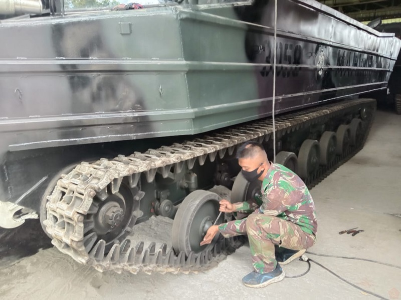 Dengan tetap melaksanakan Protokol Kesehatan Covid-19, prajurit “Kuda Putih” Batalyon Kendaraan Amfibi Pengangkut Artileri 1 Marinir (Yonkapa 1 Mar) melaksanakan pemeliharaan dan perawatan (Harwat) rutin Kendaraan Tempur (Ranpur) di Garase Ranpur Yonkapa 1 Kesatrian Marinir Hartono Cilandak, Jakarta Selatan, Senin (01/03/2021).