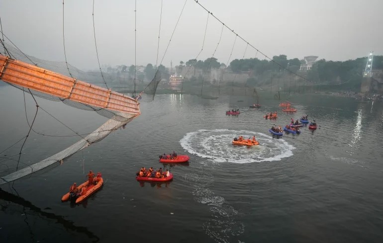 Siberindo.co (Morbi) – Korban tewas akibat runtuhnya jembatan gantung era kolonial di negara bagian Gujarat barat India mencapai 132 orang. Demikian menurut para pejabat, ketika petugas penyelamat  masih bekerja sepanjang malam, menyisir sungai Machhu mencari korban selamat.