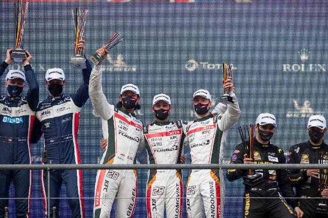 Sean Gelael, Tom dan Stoffel naik podium di Spa Francorchamps, Sabtu malam 1 Mei 2021. (jagonya ayam)
