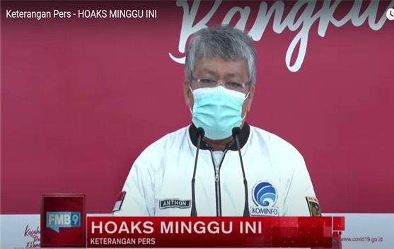 Kordinator Pengendalian Konten Internet Ditjen Aplikasi Informatika Kementerian Kominfo, Anthonius Malau mengatakan saat keterangan Persnya di Ruang Media Center KPC PEN, Selasa (02/02/2021). Akhir minggu ke-empat Januari 2020 hingga 1 Februari 2021, pihaknya telah menemukan1402 kasus hoaks terkait Covid-19.