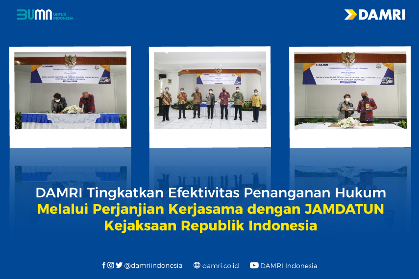 Perjanjian Kerjasama tersebut ditandatangani oleh Direktur Utama DAMRI Setia N. Milatia Moemin dengan Jaksa Agung Muda Bidang Perdata dan Tata Usaha Negara (JAMDATUN) Kejaksaan Republik Indonesia Feri Wibisono SH, MM, CN.