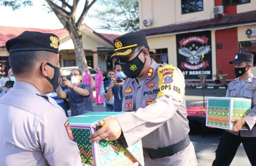 Setelah upacara kenaikan pangkat, kegiatan dilanjutkan dengan pemberian paket lebaran kepada seluruh personel Polres dan jajaran.