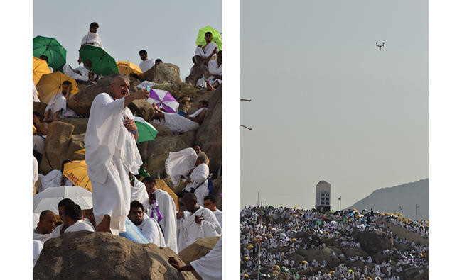 Para peziarah di Gunung Arafat (kiri) dan sebuah drone yang membawa kamera video terbang di atas Gunung Arafat saat para peziarah berada di berdoa.(Foto: File Arab News oleh Mahad Mohamed)