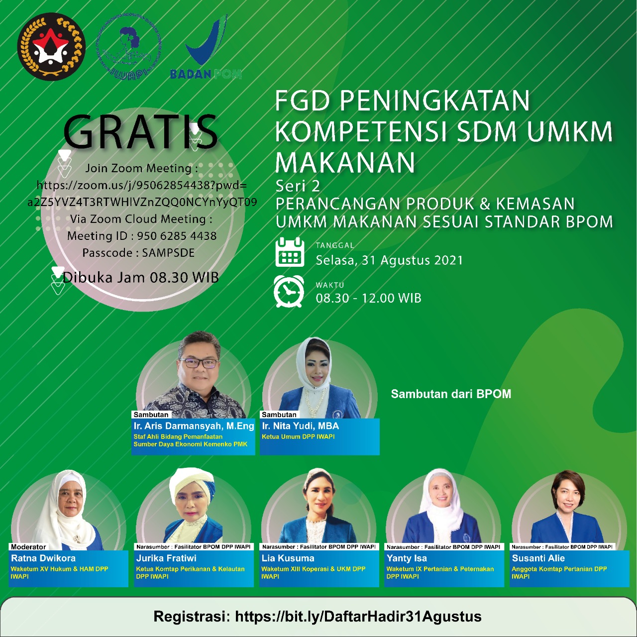 JAKARTA – FGD Perancangan Produk dan Kemasan UMKM Makanan Sesuai Standardisasi BPOM (02/09), yang diselenggarakan oleh KEMENKO PMK, Ir. Aris Darmansyah, M.Eng selaku Staf Ahli Bidang Pemanfaatan Sumberdaya Ekonomi bekerjasama dengan IWAPI (ikatan Wanita Pengusaha Indonesia). DIhadiri oleh 120 peserta dari seluruh Indonesia.