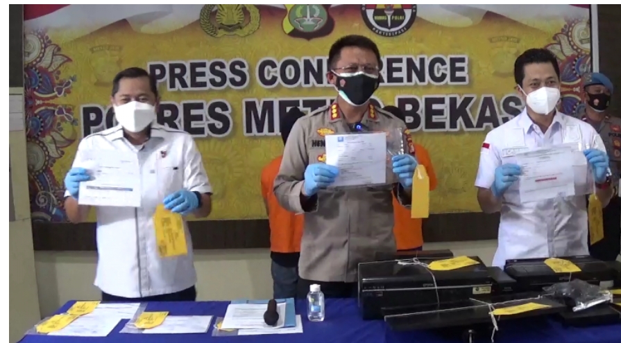 Dari tersangka, pihak Polrestro Bekasi mengamankan barang bukti diantaranya satu unit lengkap komputer, dua unit printer, satu unit mesin scaner, tiga lembar sertifikat vaksin, sembilan lembar surat hasi tes swab antigen, dan empat lembar surat hasil pemeriksaan antibody.