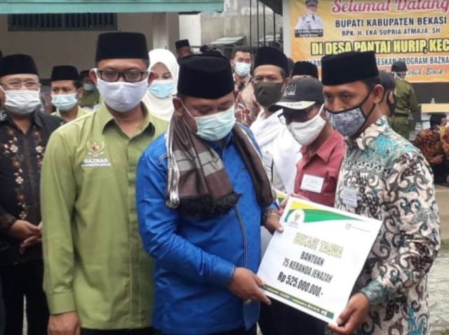 Bupati Bekasi ( baju biru) salurkan bantuan dari Baznas disaksikan Ketua Baznas Kabupaten Bekasi, H. Abdul Azis (baju hijau). (agus)