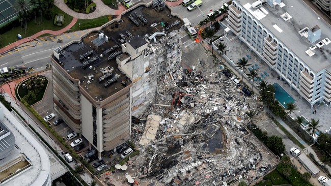 Bagian yang tersisa dari bangunan kondominium Champlain Towers South 12 lantai, di Surfside, Florida, yang sebagian runtuh 24 Juni 2021,. (Foto: Reuters/CNN Indonesia)