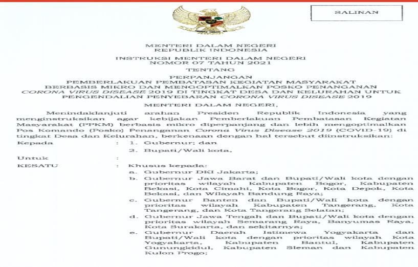 Perpanjangan PPKM Mikro ini dikuatkan dengan dikeluarkannya Instruksi Menteri Dalam Negeri (Inmendagri) Nomor 7 Tahun 2021 yang dikeluarkan dan ditandatangani oleh Menteri Dalam Negeri (Mendagri) Muhammad Tito Karnavian, pada hari ini, Senin (5/4/2021).