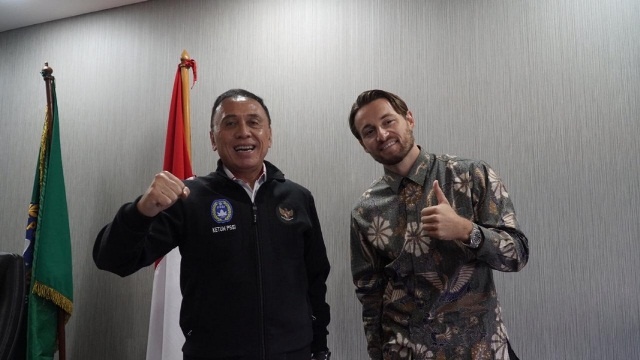 Ket. foto – Marc Klok asal Belanda menyatakan gembira jadi warga negara Indonesia. Klok bersama KU PSSI Iwan Bule. (pssi)