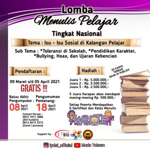 Lomba menulis untuk Pelajar Sekolah Lanjutan Atas (SLTA) SMA/SMK/MA tingkat Nasional segera digelar. Kali ini, lomba diselenggarakan Indonesian Youth Democracy and Strategic Issues Studies (IYDSI). Tujuannya, untuk meningkatkan semangat serta kemampuan menulis di kalangan pelajar.