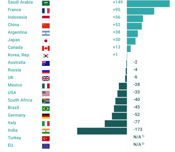 Dalam kelompok negara G20, peringkat negara pesaing Digital Risers menunjukkan hal amat menarik, terlebih bagi dua negara raksasa, China dan Amerika Serikat.
