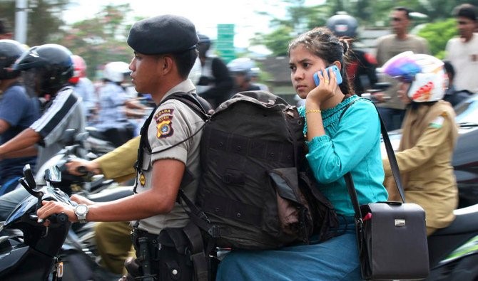 Seorang polisi mengevakuasi istrinya dengan sepeda motor di Banda Aceh, ketika gempa kuat melanda salah satu provinsi di Indonesia itu, 11 April 2012. (Foto: File Reuters/Arab News)
