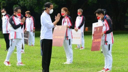 JAKARTA – Presiden Joko Widodo menyerahkan bonus apresiasi bagi para atlet dan para pelatih Indonesia yang berlaga di Olimpiade Tokyo 2020. Acara digelar dengan menerapkan protokol kesehatan yang ketat di halaman Istana Kepresidenan Bogor, Jawa Barat, Jumat, 13 Agustus 2021. Seperti dilaporkan mimbar-rakyat.com grup siberindo.co