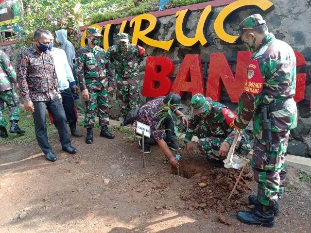Kodim 0615 / Kuningan memfasilitasi penanaman tiga ribu bibit pohon di obyek wisata Curug Bangkong, Desa Kertawirama, Kecamatan Nusaherang, Kamis. Terlihat penanaman secara simbolis. (dien)