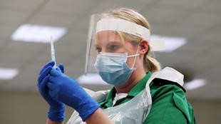 Seorang relawan Ambulans St John memegang jarum suntik selama kursus pelatihan vaksinasi penyakit coronavirus (COVID-19) di Princess Anne Training Center di Derby, Inggris 28 November 2020.(Foto File Reuters/France 24)