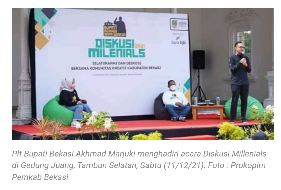 Pada acara Bupati Sapa Warga melalui Diskusi Millenials yang diinisiasi oleh Bagian Protokol dan Komunikasi Pimpinan, Pemerintah Kabupaten Bekasi, di Gedung Juang, Tambun Selatan, Sabtu (11/12), Marjuki menyampaikan kesiapannya mewadahi dan memfasilitasi para komunitas tersebut dengan membuat ruang publik hijau terbuka untuk para komunitas kreatif di Kabupaten Bekasi.