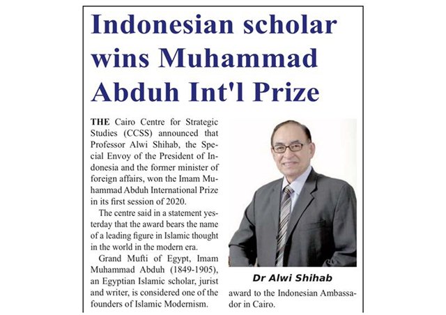 JAKARTA – (Mesir) Pusat Kajian Cairo Center for Strategic Studies (CCSS) menyampaikan Dr. Alwi Shihab, Utusan Khusus Presiden dan mantan Menteri Luar Negeri Indonesia, memenangkan penghargaan “Imam Muhammad Abdo International Prize” untuk 2020. Seperti dilaporkan mimbar-rakyat.com grup siberindo.co.