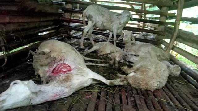 “Saat Saya akan beri makan kambing tadi pas pukul 05.30 WIB, biasanya kan mereka pada berdiri menunggu pakan diberikan. Nah, ini malah pada diam saja, tak ada yang berdiri, terus pas dicek eh ternyata tinggal separuh, yang lainnya mati dengan luka di leher,” ujarnya.