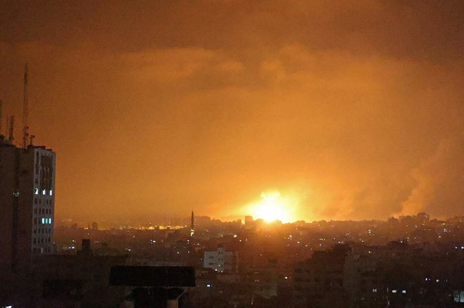 Sebuah ledakan menerangi langit setelah serangan udara Israel di Beit Lahia, di Jalur Gaza utara, pada 14 Mei 2021. (Foto: File AFP/Arab News)