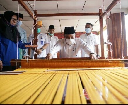 Walikota mencoba alat tenun songket.