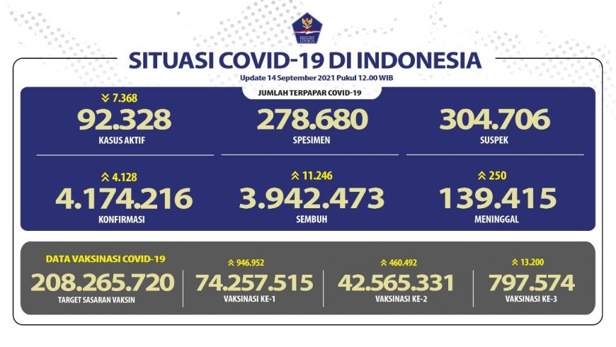 Untuk perkembangan program vaksinasi, penerima vaksin ke-1 terus bertambah ( per 14 September) sebanyak 946.952 orang dengan totalnya melebihi 74 juta orang atau 75.257.515 orang. Sedangkan yang menerima vaksinasi ke-2 juga meningkat melebihi 42 juta orang atau angka tepatnya 42.565.331 orang termasuk tambahan sebanyak 460.492 orang. Serta penerima vaksin ke-3 bertambah sebanyak 13.200 orang dan kumulatifnya sebanyak 797.574 orang. Untuk target sasaran vaksinasi berada di angka 208.265.720 orang.