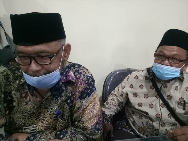 hotimah KH Achidin Noor, didampingi juru bicara Ponpes HK, Ustad Sanwani, masih menanti pernyataan maaf dari Ketua DPRD Kuningan, Nuzul Rachdy. (dien)