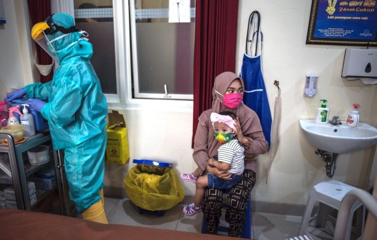 Seorang ibu warga Indonesia menggendong bayinya untuk urusan polio saat tenaga medis menyiapkan vaksin TB untuk vaksin  polio oral di sebuah puskesmas pada 30 Juni lalu. (File AFP/Al Jazeera)