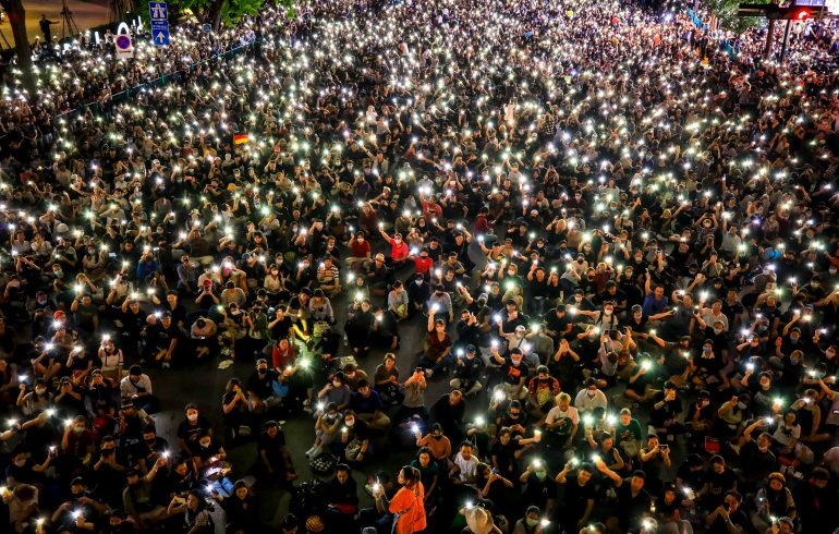 Pengunjuk rasa pro-demokrasi berkumpul dan mengangkat ponsel mereka saat melakukan unjuk rasa menentang deklarasi darurat pemerintah.(Foto EPA/Al Jazeera)