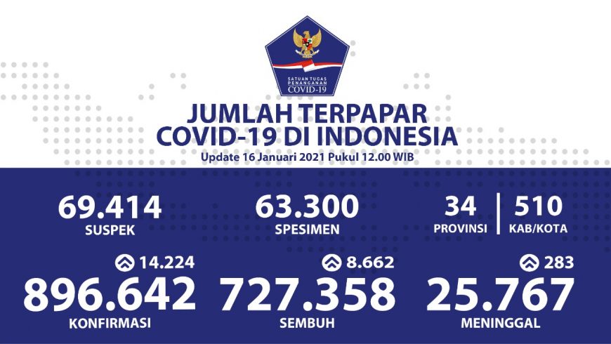 Tim Komunikasi Komite Penanganan Corona Virus Disease 2019 (COVID-19) dan Pemulihan Ekonomi Nasional yang dikutip melalui covid19.go.id, menginformasikan, pada penambahan pasien terkonfirmasi positif harian, Sabtu (16/1) bertambah sebanyak 14.224 kasus. Jumlah kumulatifnya, atau pasien terkonfirmasi positif yang tercatat sejak kasus pertama hingga saat ini, mencapai 896.642 kasus. Sementara jumlah negatif Covid-19 dari hasil periksa laboratorium, sebanyak 31.134 orang dan kumulatifnya 4.624.416 orang.