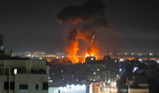 Ledakan menerangi langit malam di atas gedung-gedung di Kota Gaza saat pasukan Israel menembaki daerah kantong Palestina itu, pada awal 16 Juni 2021. (Foto: AFP/Arab News)