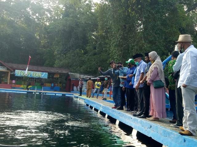 Keteranganfoto – Para pengunjung menyaksikan ikan dewa di kolam wisata yang terdapat di Cibulan, Kuningan. (dien)