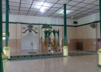 Ketika memasuki bagian dalam masjid, terlihat empat pilar dari kayu berwarna hijau. Masjid dilengkapi dengan enam jendela berwarna hijau dengan kaca berwarna kuning.