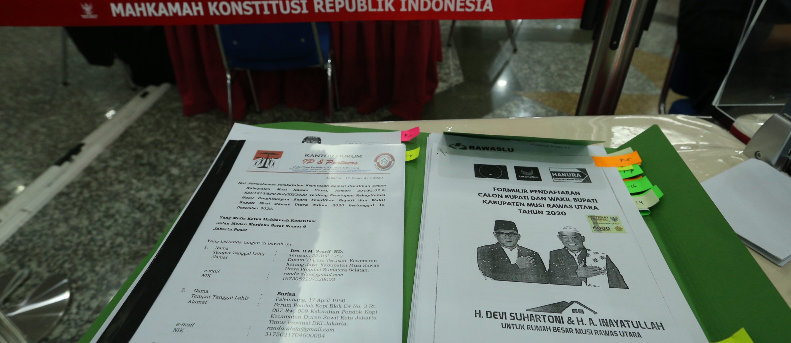 JAKARTA – Permohonan Perselisihan Hasil Pemilihan (PHP) Bupati Musi Rawas Utara Tahun 2020 menjadi permohononan luring pertama yang masuk ke bagian penerimaan permohonan Mahkamah Konstitusi (MK) pada Kamis (17/12/2020), pukul 10: 17: 14 WIB. Pemohonnya adalah Pasangan Calon No. Urut 3 H.M Syarif dan Surian. Calon petahana ini menggugat keputusan KPU Musi Rawas Utara yang menetapkan Pasangan Calon No. Urut 1 Devi Suhartono dan Innayatullah sebagai pemenang Pemilihan Bupati Musi Rawas Utara Tahun 2020 karena melanggar asas pemilu yang luber dan jurdil.