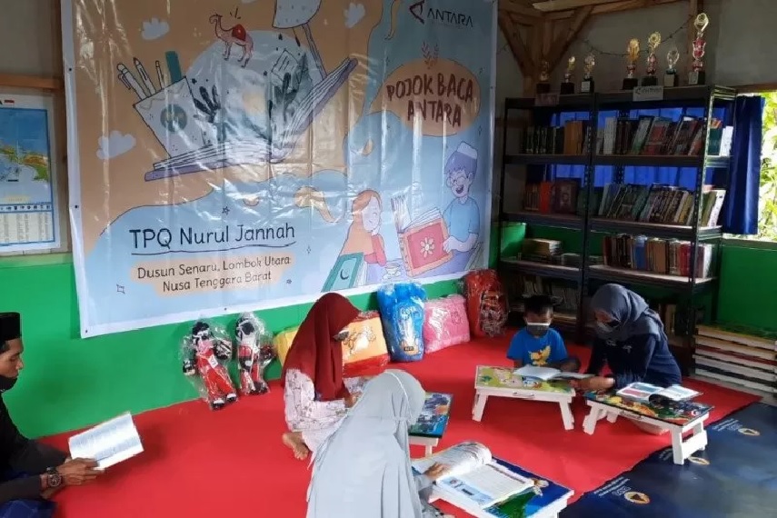 Perum LKBN ANTARA menyediakan “Pojok Baca” di Taman Pendidikan Al Quran (TPQ) Nurul Jannah Dusun Senaru, Lombok Utara, Nusa Tenggara Barat, tepatnya di kaki Gunung Rinjani.