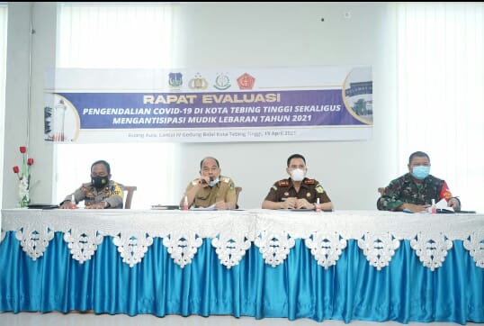 Walikota Tebing Tinggi H. Umar Zunaidi Hasibuan dalam Rapat Evaluasi Pengendalian Covid-19 Sekaligus Mengantisipasi Mudik Lebaran Tahun 2021 di kota Tebing Tinggi, Senin (19/4) di Aula Balai Kota. Seperti dilaporkan mimbar-rakyat.com grup siberindo.co.