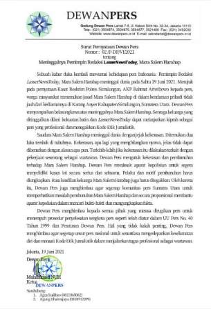 “Dewan Pers menyampaikan belasungkawa atas meninggalnya Mara Salem Harahap. Semoga keluarga yang ditinggalkan diberi kekuatan batin dan LasserNewsToday dapat melanjutkan kiprah sebagai pers yang profesional dan menegakkan Kode Etik Jurnalistik,” kata Mohamumad Nuh dalam siarannya.