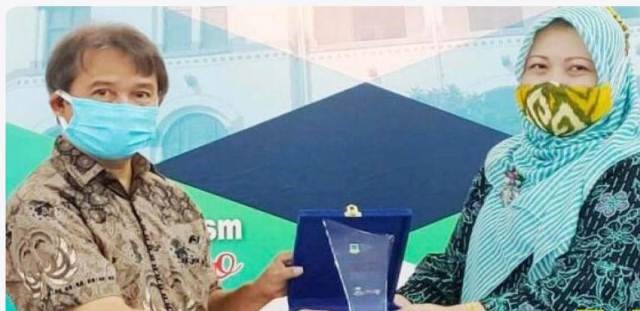 Kabid Pemasaran Wisata Dispar Kabupaten Bekasi, Tri Cahyani ( kanan) saat menerima plakat penghargaan. (agus)