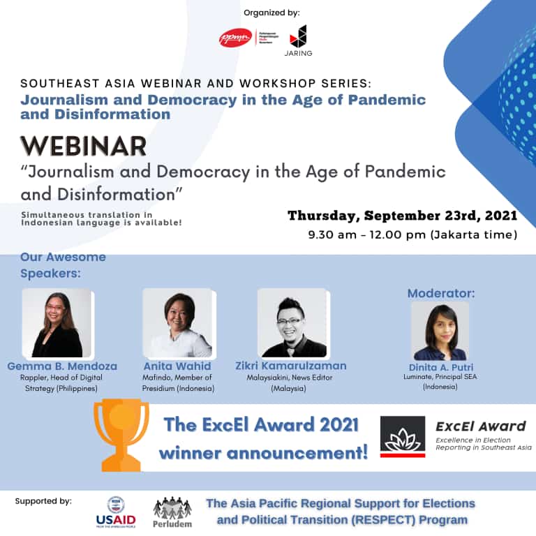 JAKARTA – Sejumlah jurnalis dari Asia Tenggara akan membahas isu disinformasi dan demokrasi di kawasan dalam seri webinar dan lokakarya daring bertajuk Journalism and Democracy in the Age of Pandemic and Disinformation yang dihelat oleh Perhimpunan Pengembangan Media Nusantara (PPMN). Seperti dilaporkan mimbar-rakyat.com grup siberindo.co
