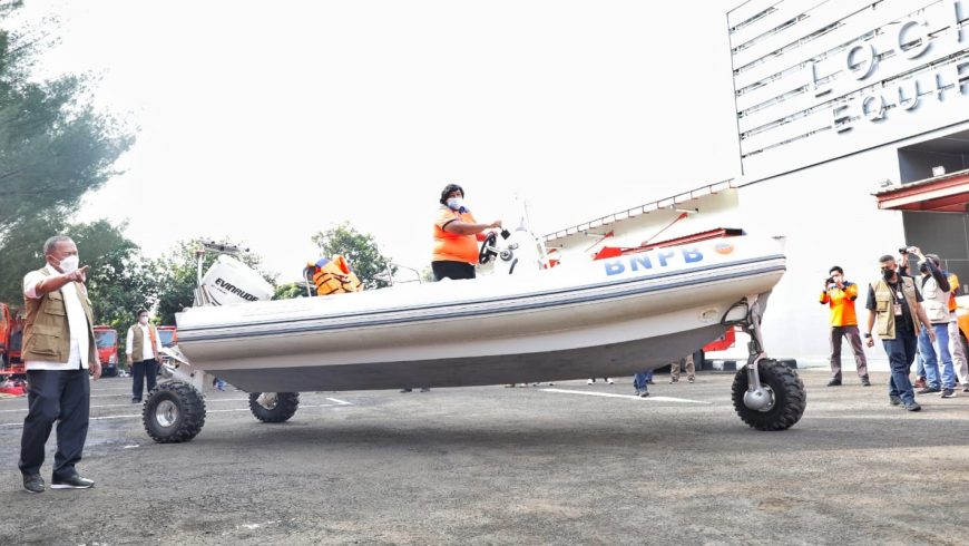Kepala Badan Nasional Penanggulangan Bencana (BNPB) Letjen TNI Ganip Warsito melakukan pengecekan perahu amphibi dalam kegiaran gelar kesiapan peralatan pendukung penanggulangan bencana di Gudang Logistik, Sentul, Minggu (22/8). (Foto: Komunikasi Kebencanaan BNPB/Apri Setiawan)