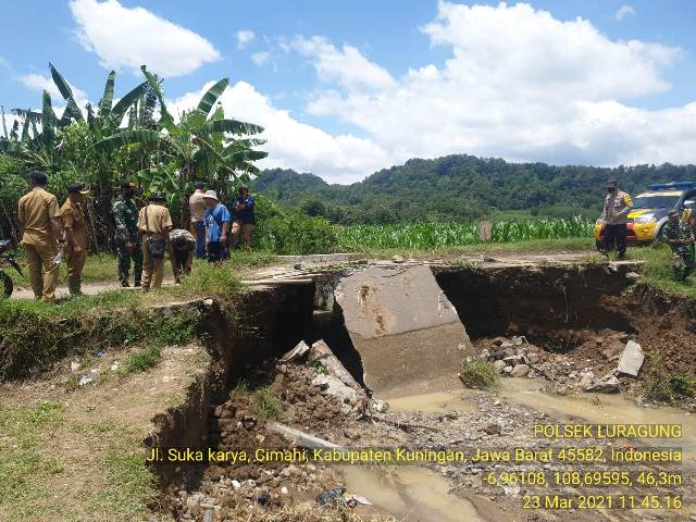 Kepala Pelaksana BPBD Kuningan, Indra Bayu Permana, mengatakan jembatan amblas tersebut merupakan bencana tanah longsor. “Kejadian awalnya pada Hari Senin (22/03) petang sekira pukul 18:00 WIB. Namun menurut informasi terakhir, Selasa (23/03) sore sekira pukul 15:30 WIB terjadi longsoran lebih besar,” jelasnya