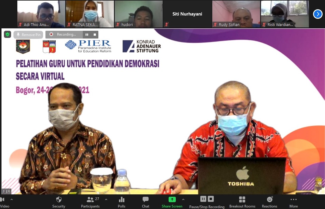 BOGOR – Paramadina Institute for Education Reform (PIER) Universitas Paramadina Jakarta bekerjasama dengan Konrad Adenauer Stiftung (KAS) Jerman, Kemendagri, dan Dinas Pendidikan Kota Bogor kembali menyelenggarakan Pelatihan Guru untuk Pendidikan Demokrasi di Kota Bogor. Kegiatan serupa pernah dilakukan di Bogor pada tahun 2017. Berbeda dengan pelatihan sebelumnya, pelatihan kali ini diselenggarakan secara online.