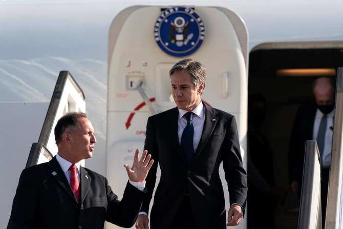 Menteri Luar Negeri AS Antony Blinken disambut oleh Kepala Protokol Negara Israel Gil Haskel, saat ia turun dari pesawat, setibanya di Bandara Internasional Ben Gurion, 25 Mei 2021. (Foto: Reuters/Arab News)