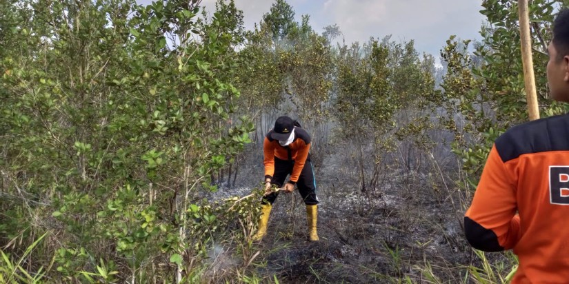BPBD Kabupaten Sukamara melakukan pemadaman dengan alat pemukul api tradisional atau kepyok pada lahan yang terbakar di Desa Pusu, Kecamatan Sukamara, Provinsi Kalimantan Tengah. (Foto : BPBD Kabupaten Sukamara)