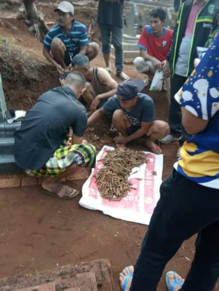 “Saya dan warga lain sedang membersihkan rerumputan di kawasan pemakaman. Saat menggarap tanah yang menggunung, ternyata cangkul saya membentur benda keras seperti batu. Kemudian saya koreh, ternyata bukan batu melainkan seperti bom. Kemudian saya koreh lebih dalam ternyata masih ada bom lagi juga peluru panjang,” ujarnya.