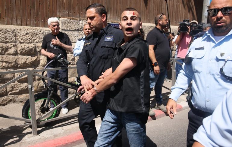 Angota keamanan Israel menangkap seorang pengunjuk rasa di luar pengadilan di Yerusalem, Rabu lalu, saat terjadi demonstrasi atas rencana pengusiran Israel atas keluarga Palestina di distrik Silwan. Foto: AFP/Al Jazeera)