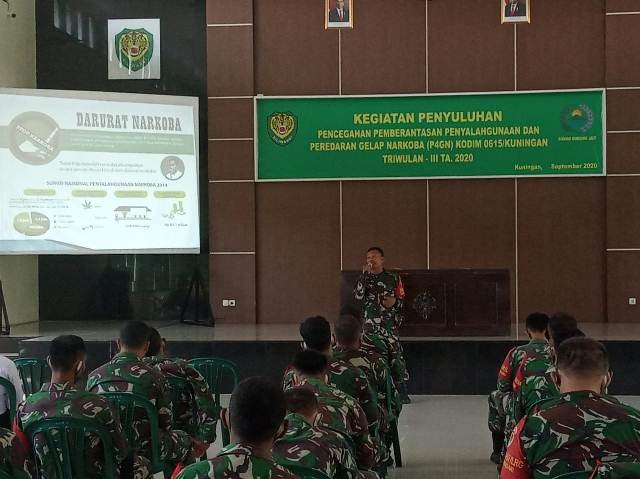 Kemandan Kodim 0615 / Kuningan, Letkol Czi Karter Joyi Lumi mengatakan hal itu dalam kegiatan penyuluhan pencegahan, pemberantasan, penyalahgunaan dan peredaran gelap Narkoba (P4GN) Kodim 0615 / Kuningan, Triwulan – III TA 2020, Senin, di di aula Mas’ud Wisnusaputra,makodim 0615/Kuningan.