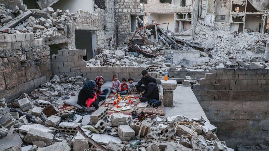 Foto yang diambil pada 4 Mei 2020, di bulan suci puasa Ramadhan, menunjukkan anggota keluarga Tareq Abu Ziad Suriah yang terlantar, dari kota Ariha di pedesaan selatan provinsi Idlib, mereka berbuka puasa bersama di tengah-tengah puing-puing rumah mereka yang hancur ketika kembali ke kota suatu hari setelah melarikan diri selama serangan militer oleh pasukan pemerintah Suriah dan sekutu mereka. (Foto File AFP/Arab News)