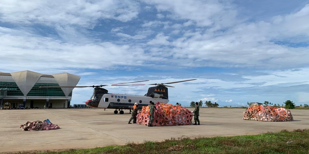 Tanpa harus mendarat, helikopter tetap berputar di udara. Personel Satgas TNI AU yang sigap kembali mengaitkan bantuan seberat 4 ton ke tali. Sekejap helikopter Chinook mengudara dan menghilang dari pandangan mata.