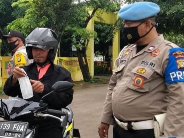 Personil Polsek Setu berikan masker kepada pengguna sepeda motor.