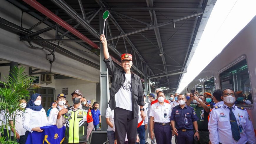 Gubernur Jawa Tengah Ganjar Pranowo melepas peserta Mudik Gratis Pemprov Jateng menggunakan KA Tawang Jaya Premium (Pasar Senen – Semarang Tawang), pada 29 April dengan 320 peserta. Ganjar Pranowo juga turut dalam rombongan mudik gratis tersebut.(Foto: kai.id)